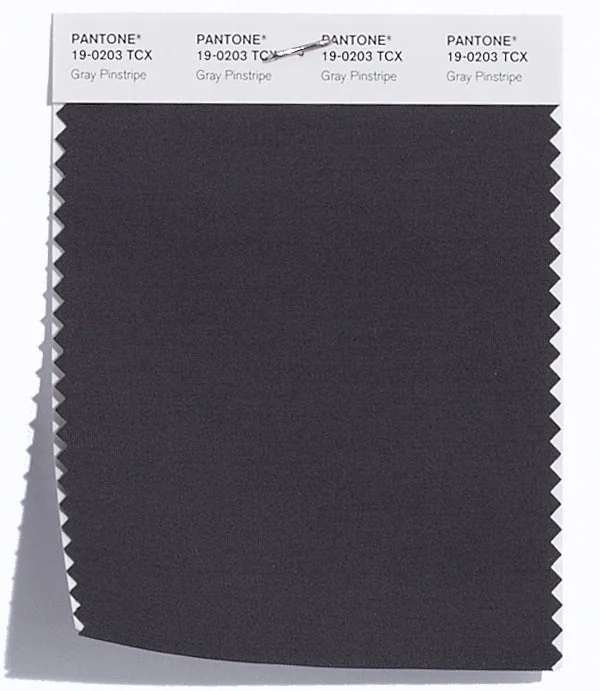 Gray Pinstripe is a deep and rich black from the Pantone TCX collection, identified by the code 19-0203 TCX. This cool tone with its balanced character makes it an excellent choice for luxury branding, formal wear, and sophisticated design.