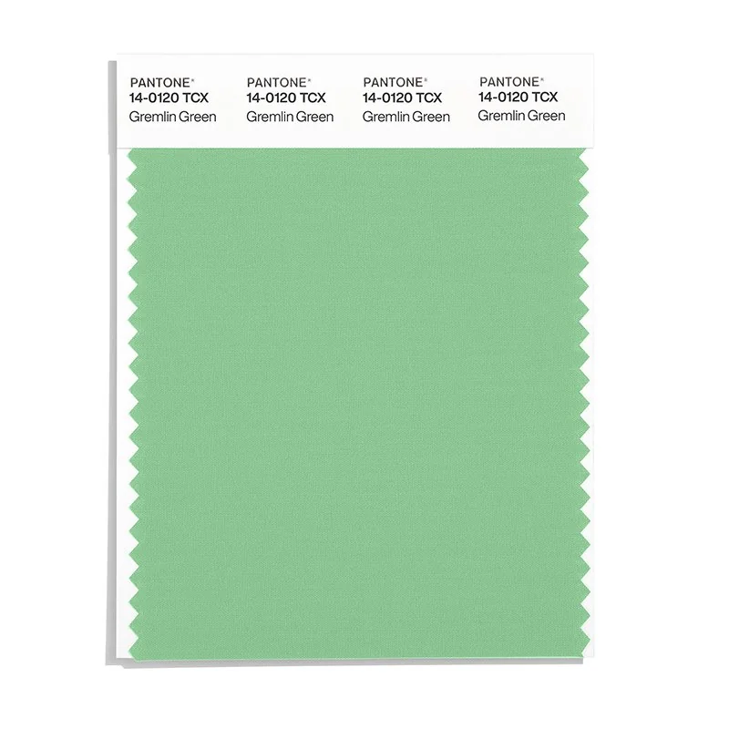 Gremlin Green is a medium-toned green from the Pantone TCX collection, identified by the code 14-0120 TCX. This cool tone with its balanced character makes it an excellent choice for sustainability, nature brands, and eco-friendly design.