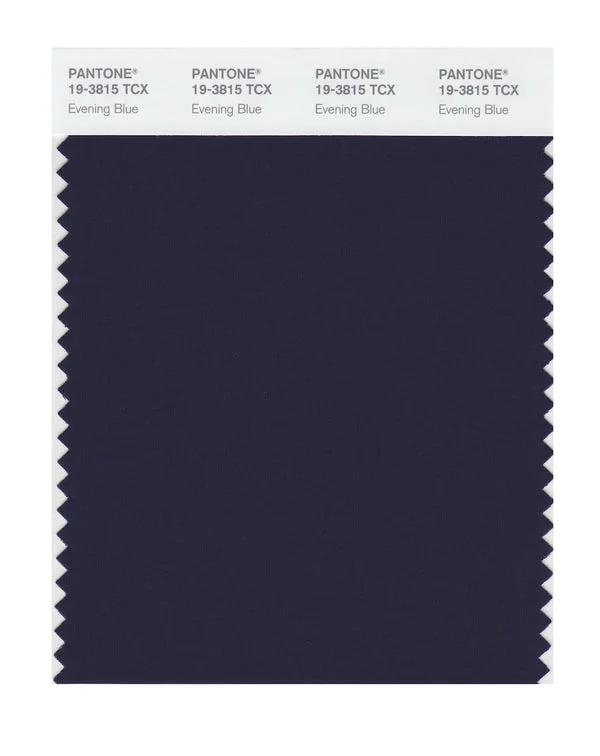 Evening Blue is a deep and rich color from the Pantone TCX collection, identified by the code 19-3815 TCX. This cool tone with its balanced character makes it an excellent choice for deep sophistication, premium denim, and artistic branding.