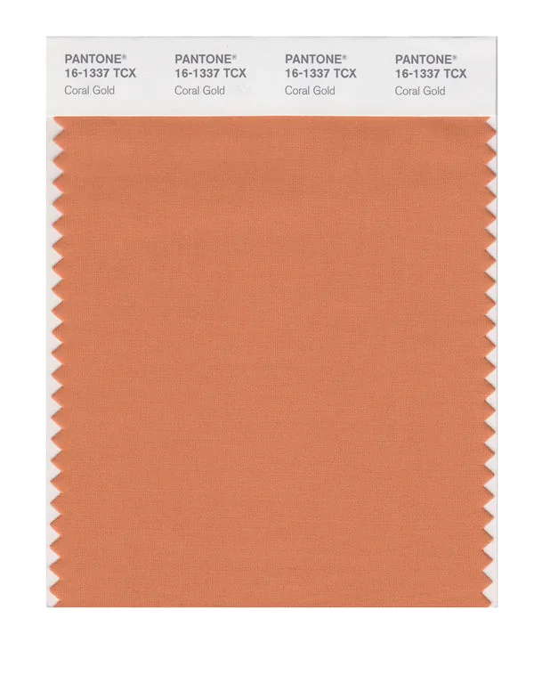 Coral Gold is a medium-toned orange from the Pantone TCX collection, identified by the code 16-1337 TCX. This warm tone with its balanced character makes it an excellent choice for energetic branding, autumn collections, and creative spaces.