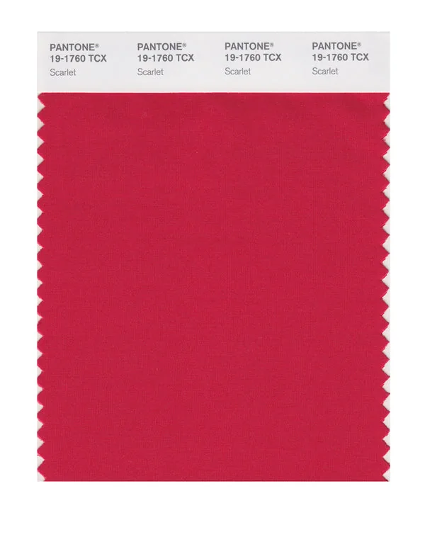 Scarlet is a medium-toned red from the Pantone TCX collection, identified by the code 19-1760 TCX. This warm tone with its balanced character makes it an excellent choice for bold branding, passionate designs, and statement pieces.