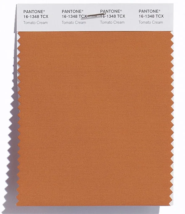 Tomato Cream is a medium-toned orange from the Pantone TCX collection, identified by the code 16-1348 TCX. This warm tone with its balanced character makes it an excellent choice for energetic branding, autumn collections, and creative spaces.