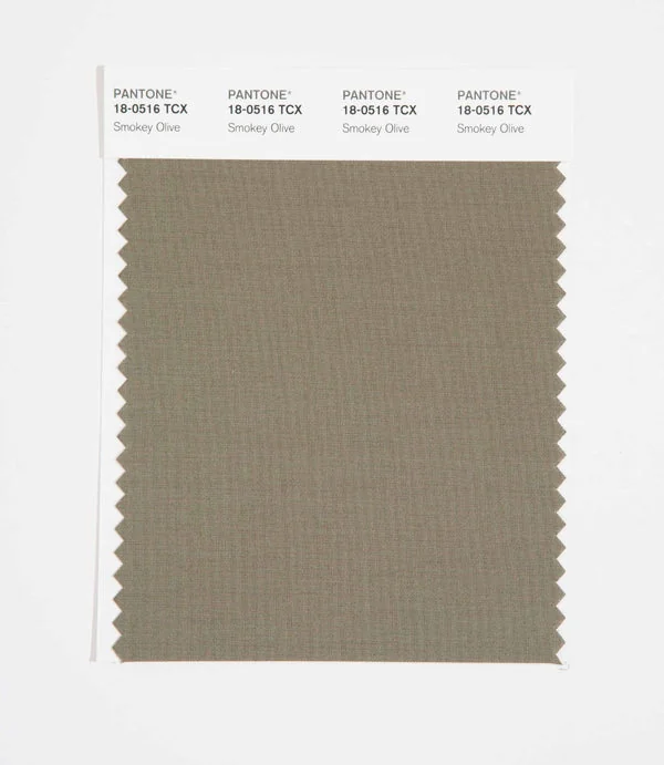 Smokey Olive is a medium-toned color from the Pantone TCX collection, identified by the code 18-0516 TCX. This warm tone with its balanced character makes it an excellent choice for natural products, military themes, and earthy design.