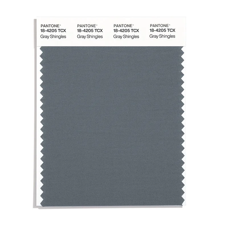 Gray Shingles is a medium-toned color from the Pantone TCX collection, identified by the code 18-4205 TCX. This cool tone with its balanced character makes it an excellent choice for industrial design, modern architecture, and tech products.