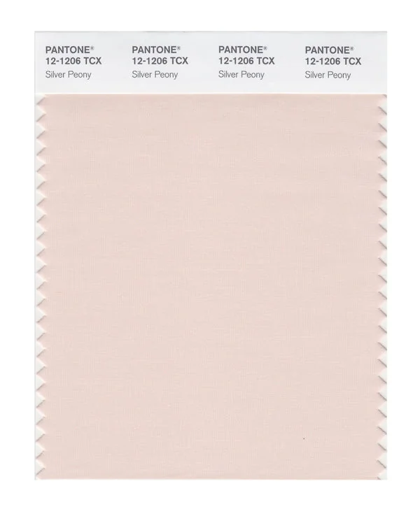 Silver Peony is a light and airy color from the Pantone TCX collection, identified by the code 12-1206 TCX. This warm tone with its soft and pastel character makes it an excellent choice for soft femininity, wellness branding, and gentle aesthetics.