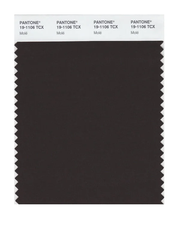 Mole is a deep and rich brown from the Pantone TCX collection, identified by the code 19-1106 TCX. This warm tone with its balanced character makes it an excellent choice for natural products, rustic design, and earthy branding.