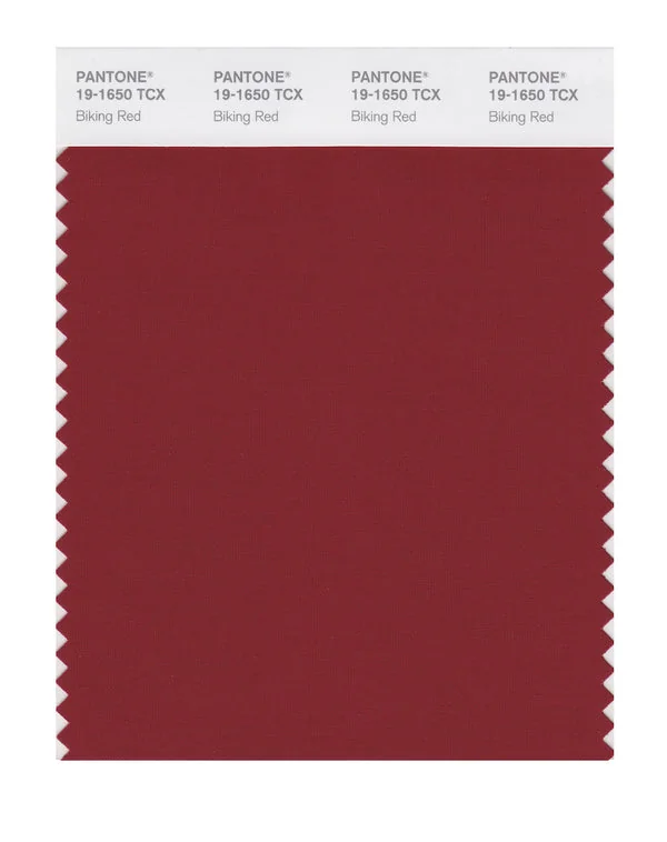 Biking Red is a deep and rich red from the Pantone TCX collection, identified by the code 19-1650 TCX. This warm tone with its balanced character makes it an excellent choice for bold branding, passionate designs, and statement pieces.