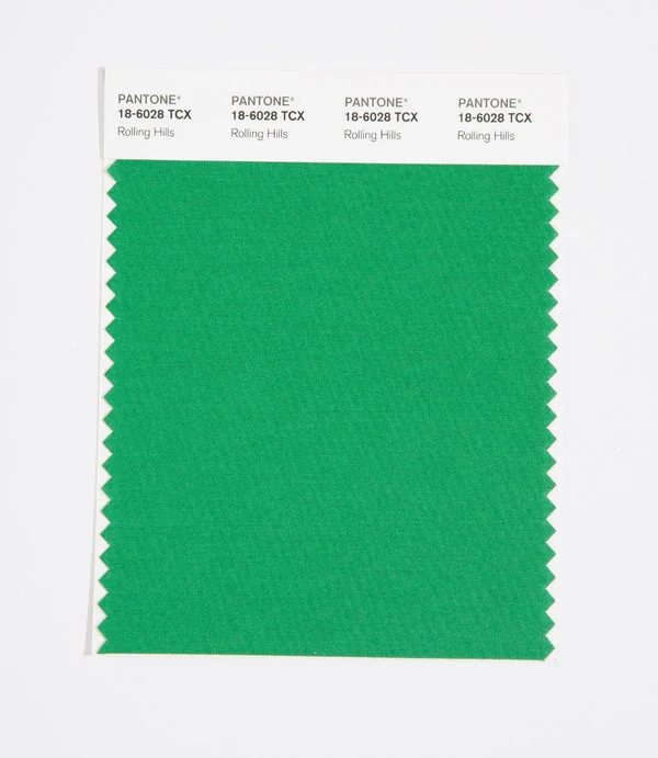 Rolling Hills is a medium-toned color from the Pantone TCX collection, identified by the code 18-6028 TCX. This cool tone with its balanced character makes it an excellent choice for wellness branding, spa environments, and serene design.