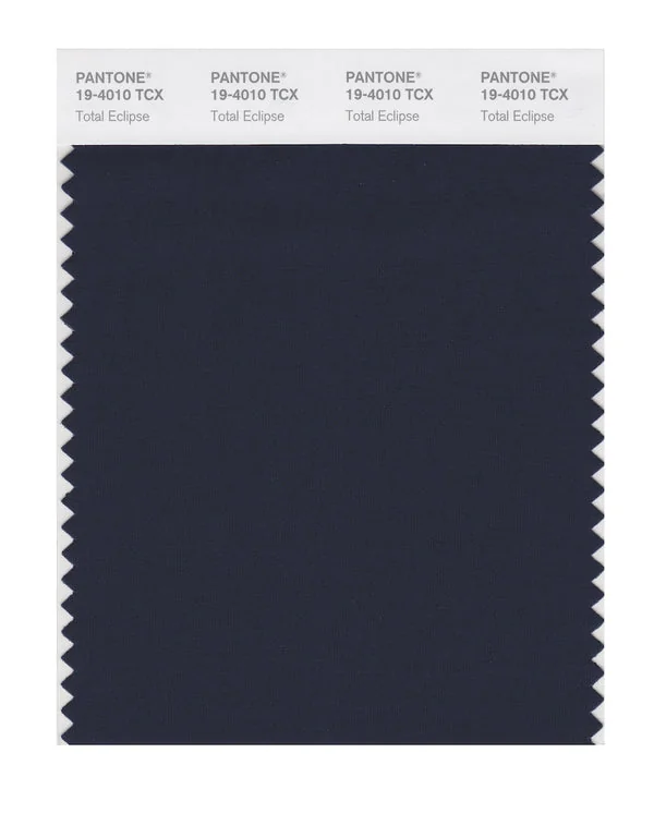 Total Eclipse is a deep and rich color from the Pantone TCX collection, identified by the code 19-4010 TCX. This cool tone with its balanced character makes it an excellent choice for professional services, maritime themes, and classic design.