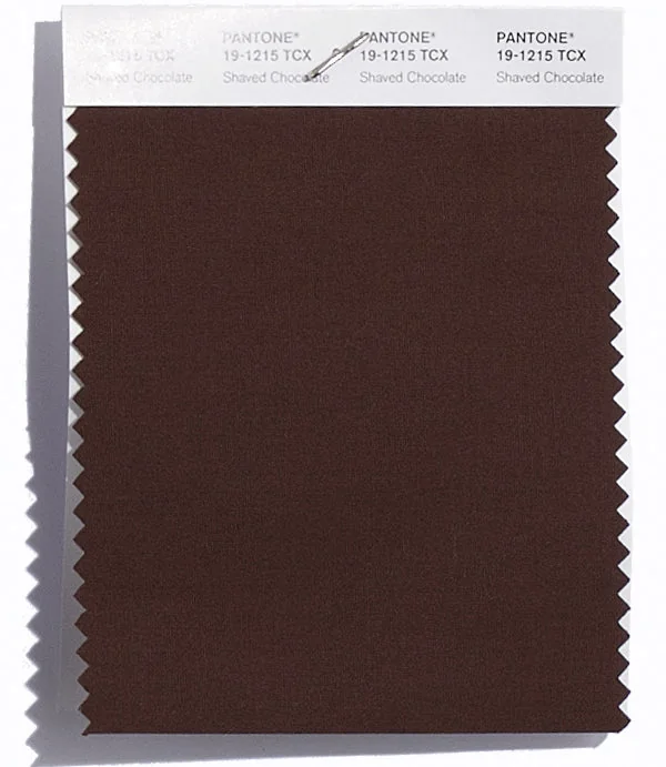 Shaved Chocolate is a deep and rich brown from the Pantone TCX collection, identified by the code 19-1215 TCX. This warm tone with its balanced character makes it an excellent choice for natural products, rustic design, and earthy branding.