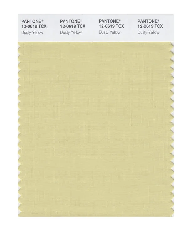 Dusty Yellow is a light and airy yellow from the Pantone TCX collection, identified by the code 12-0619 TCX. This warm tone with its balanced character makes it an excellent choice for optimistic branding, children's products, and energizing spaces.