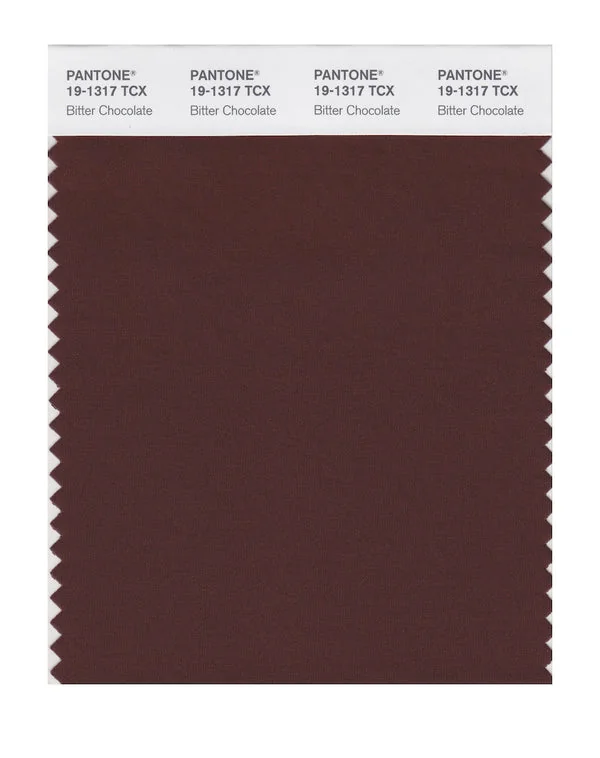 Bitter Chocolate is a deep and rich brown from the Pantone TCX collection, identified by the code 19-1317 TCX. This warm tone with its balanced character makes it an excellent choice for natural products, rustic design, and earthy branding.