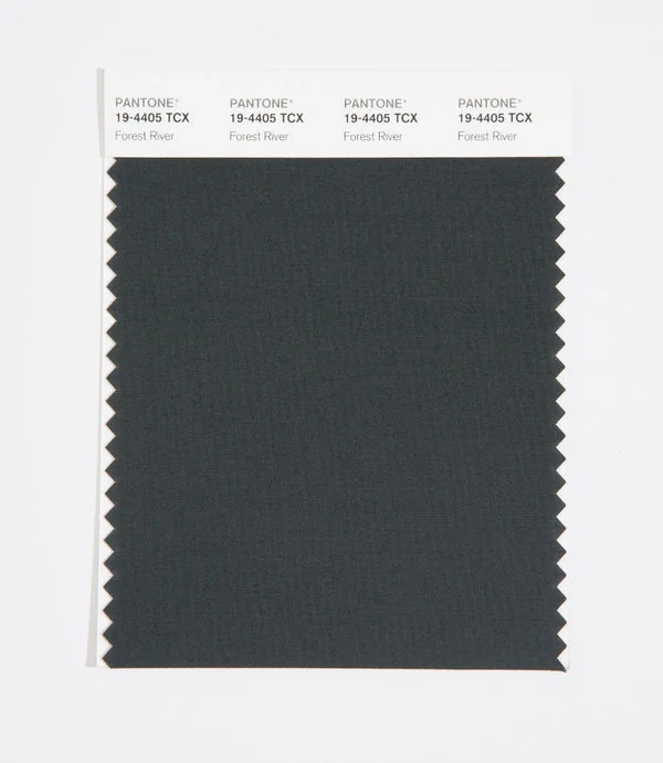 Forest River is a deep and rich color from the Pantone TCX collection, identified by the code 19-4405 TCX. This cool tone with its balanced character makes it an excellent choice for professional services, maritime themes, and classic design.