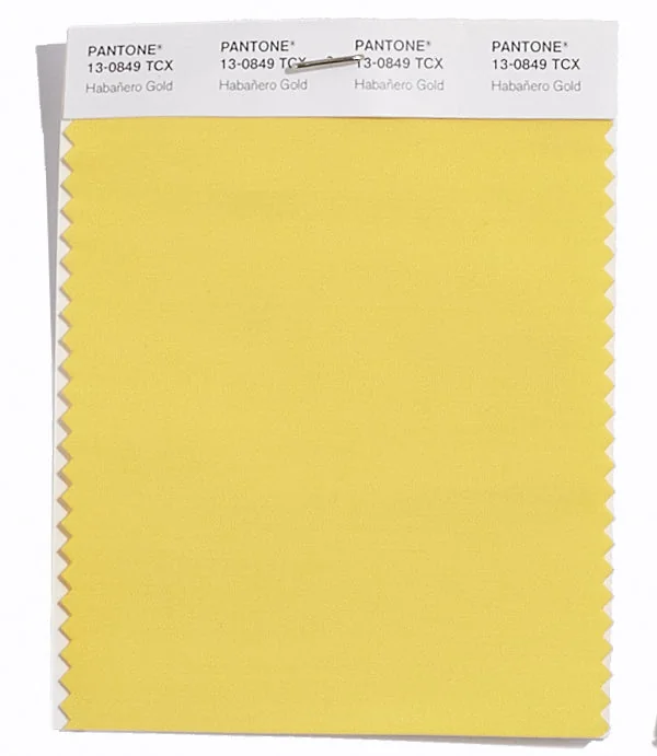Habanero Gold is a medium-toned color from the Pantone TCX collection, identified by the code 13-0849 TCX. This warm tone with its vibrant and bold character makes it an excellent choice for luxury branding, premium products, and elegant accents.