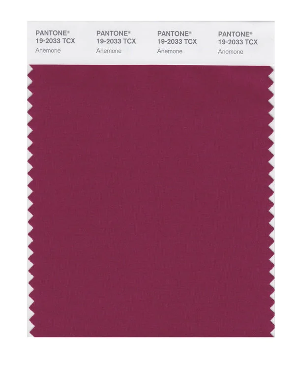 Anemone is a medium-toned red from the Pantone TCX collection, identified by the code 19-2033 TCX. This warm tone with its balanced character makes it an excellent choice for bold branding, passionate designs, and statement pieces.
