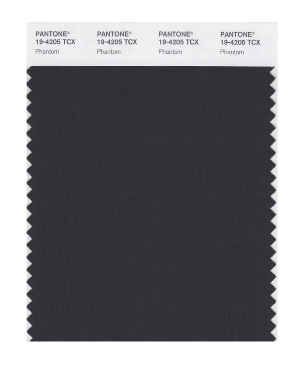 Phantom is a deep and rich black from the Pantone TCX collection, identified by the code 19-4205 TCX. This cool tone with its balanced character makes it an excellent choice for luxury branding, formal wear, and sophisticated design.