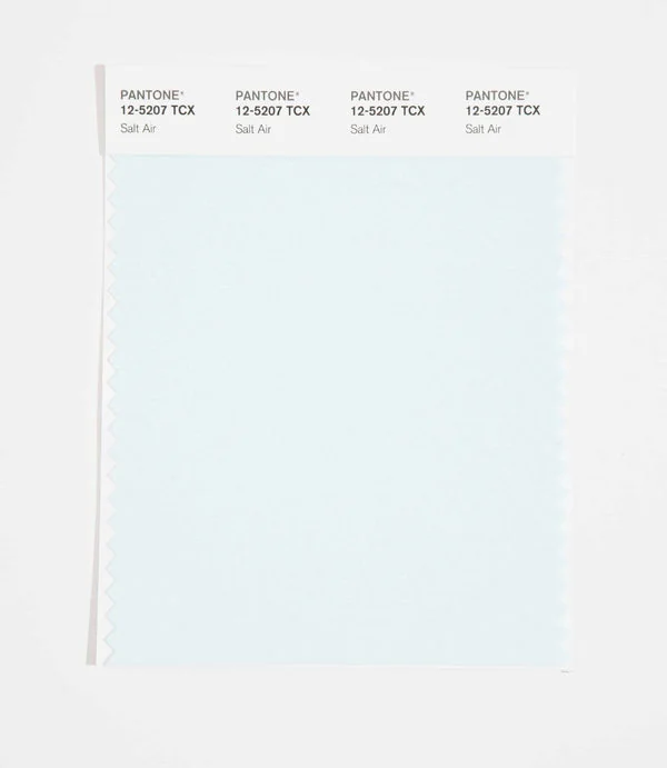 Salt Air is a light and airy color from the Pantone TCX collection, identified by the code 12-5207 TCX. This cool tone with its balanced character makes it an excellent choice for peaceful branding, baby products, and serene design.
