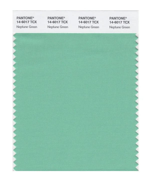 Neptune Green is a medium-toned color from the Pantone TCX collection, identified by the code 14-6017 TCX. This cool tone with its balanced character makes it an excellent choice for tropical themes, jewelry design, and exotic branding.