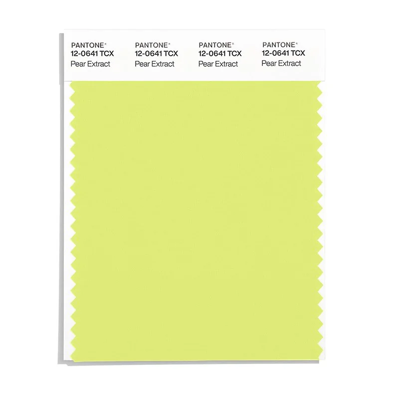 Pear Extract is a medium-toned yellow from the Pantone TCX collection, identified by the code 12-0641 TCX. This cool tone with its vibrant and bold character makes it an excellent choice for optimistic branding, children's products, and energizing spaces.