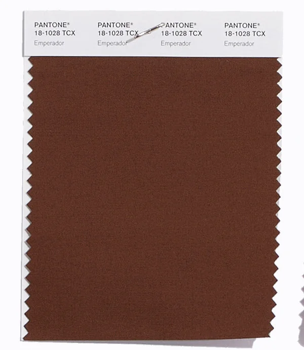 Emperador is a medium-toned brown from the Pantone TCX collection, identified by the code 18-1028 TCX. This warm tone with its balanced character makes it an excellent choice for natural products, rustic design, and earthy branding.