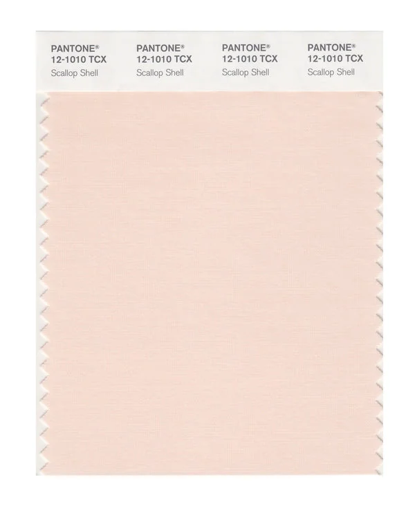 Scallop Shell is a light and airy color from the Pantone TCX collection, identified by the code 12-1010 TCX. This warm tone with its vibrant and bold character makes it an excellent choice for soft warmth, wellness products, and gentle branding.