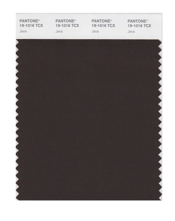 Java is a deep and rich brown from the Pantone TCX collection, identified by the code 19-1016 TCX. This warm tone with its balanced character makes it an excellent choice for natural products, rustic design, and earthy branding.