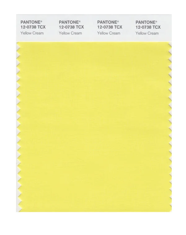 Yellow Cream is a medium-toned yellow from the Pantone TCX collection, identified by the code 12-0738 TCX. This warm tone with its vibrant and bold character makes it an excellent choice for optimistic branding, children's products, and energizing spaces.