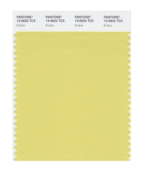 Endive is a medium-toned yellow from the Pantone TCX collection, identified by the code 13-0632 TCX. This warm tone with its balanced character makes it an excellent choice for optimistic branding, children's products, and energizing spaces.