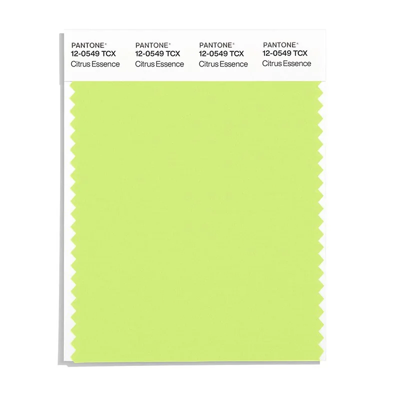 Citrus Essence is a light and airy yellow from the Pantone TCX collection, identified by the code 12-0549 TCX. This cool tone with its vibrant and bold character makes it an excellent choice for optimistic branding, children's products, and energizing spaces.