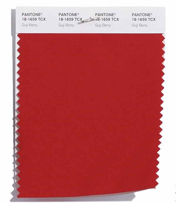 Goji Berry is a medium-toned red from the Pantone TCX collection, identified by the code 18-1659 TCX. This warm tone with its vibrant and bold character makes it an excellent choice for bold branding, passionate designs, and statement pieces.
