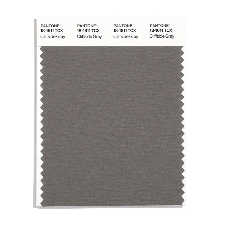 Cliffside Gray is a medium-toned color from the Pantone TCX collection, identified by the code 18-1611 TCX. This warm tone with its balanced character makes it an excellent choice for sophisticated neutrals, urban design, and modern aesthetics.