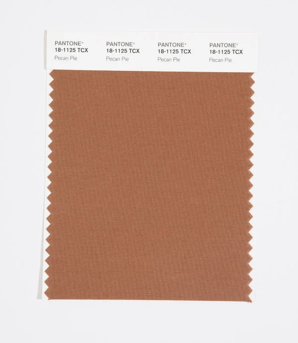 Pecan Pie is a medium-toned brown from the Pantone TCX collection, identified by the code 18-1125 TCX. This warm tone with its balanced character makes it an excellent choice for natural products, rustic design, and earthy branding.