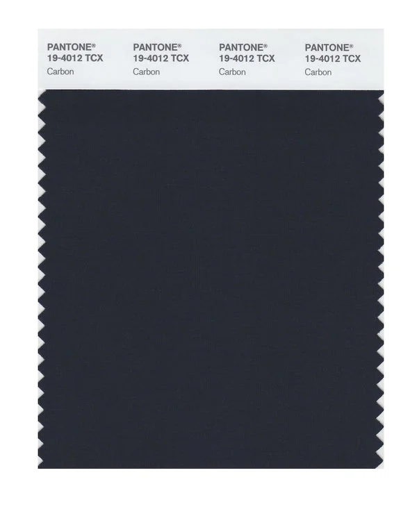 Carbon is a deep and rich color from the Pantone TCX collection, identified by the code 19-4012 TCX. This cool tone with its balanced character makes it an excellent choice for professional services, maritime themes, and classic design.