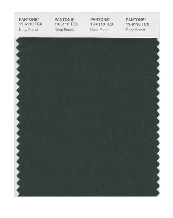 Deep Forest is a deep and rich color from the Pantone TCX collection, identified by the code 19-6110 TCX. This cool tone with its balanced character makes it an excellent choice for sophisticated branding, medical products, and calming design.