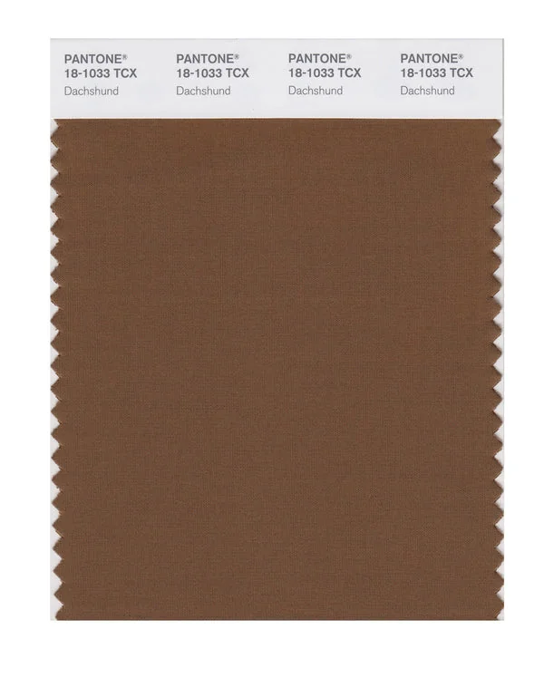 Dachshund is a medium-toned brown from the Pantone TCX collection, identified by the code 18-1033 TCX. This warm tone with its balanced character makes it an excellent choice for natural products, rustic design, and earthy branding.