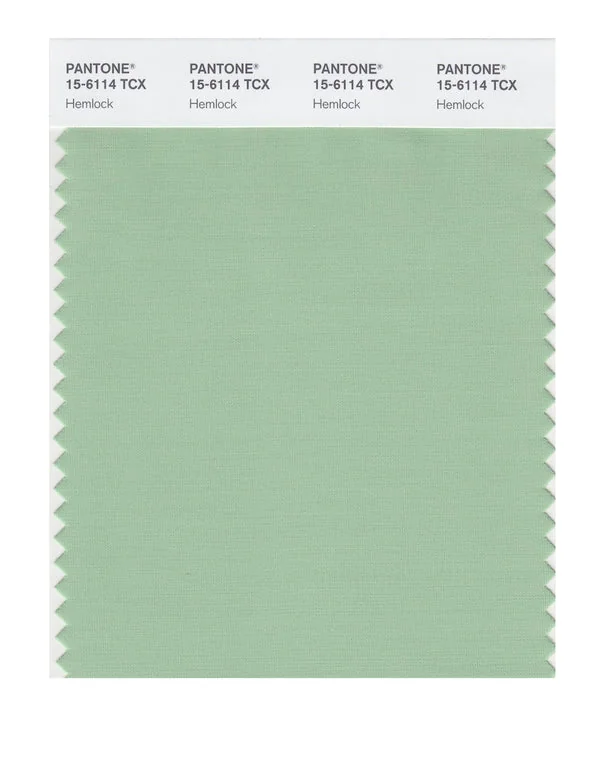 Hemlock is a medium-toned green from the Pantone TCX collection, identified by the code 15-6114 TCX. This cool tone with its balanced character makes it an excellent choice for sustainability, nature brands, and eco-friendly design.