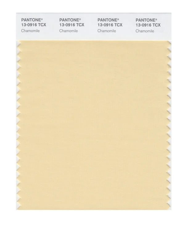 Chamomile is a light and airy color from the Pantone TCX collection, identified by the code 13-0916 TCX. This warm tone with its balanced character makes it an excellent choice for luxury branding, premium products, and elegant accents.