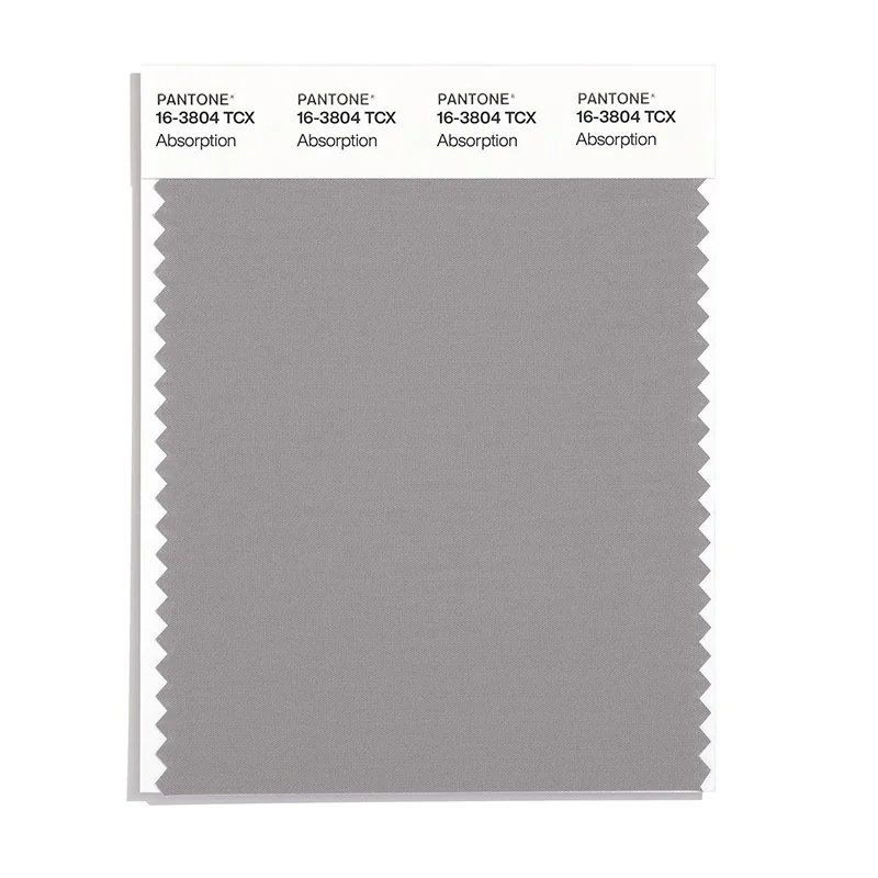 Absorption is a medium-toned gray from the Pantone TCX collection, identified by the code 16-3804 TCX. This warm tone with its balanced character makes it an excellent choice for professional environments, industrial design, and neutral foundations.