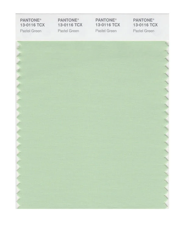 Pastel Green is a light and airy green from the Pantone TCX collection, identified by the code 13-0116 TCX. This cool tone with its balanced character makes it an excellent choice for sustainability, nature brands, and eco-friendly design.