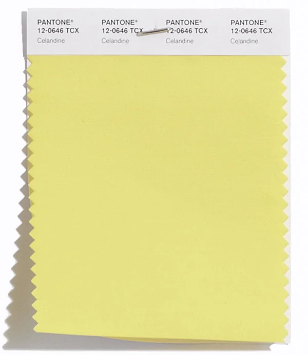 Celandine is a medium-toned yellow from the Pantone TCX collection, identified by the code 12-0646 TCX. This warm tone with its vibrant and bold character makes it an excellent choice for optimistic branding, children's products, and energizing spaces.