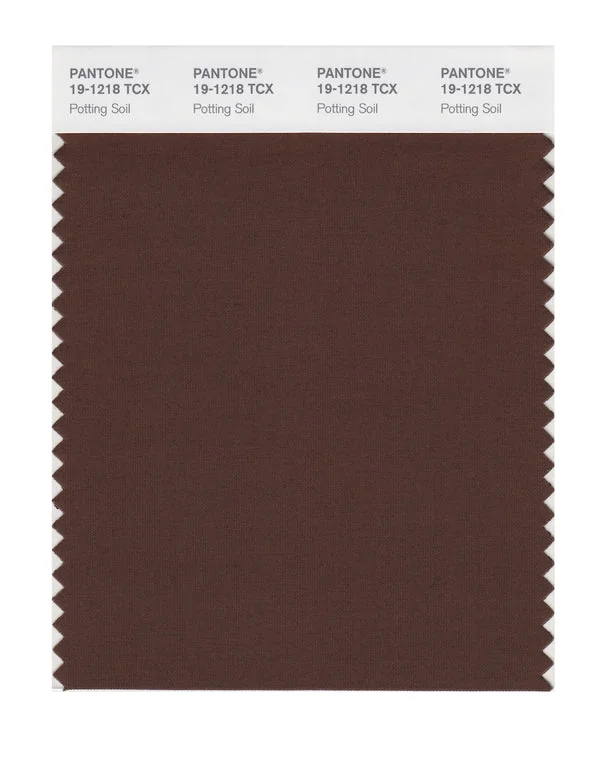 Potting Soil is a deep and rich brown from the Pantone TCX collection, identified by the code 19-1218 TCX. This warm tone with its balanced character makes it an excellent choice for natural products, rustic design, and earthy branding.