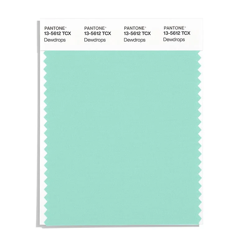 Dewdrops is a light and airy color from the Pantone TCX collection, identified by the code 13-5612 TCX. This cool tone with its balanced character makes it an excellent choice for tropical themes, jewelry design, and exotic branding.