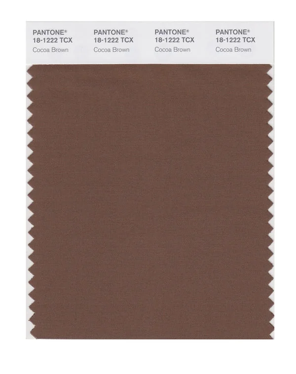 Cocoa Brown is a medium-toned brown from the Pantone TCX collection, identified by the code 18-1222 TCX. This warm tone with its balanced character makes it an excellent choice for natural products, rustic design, and earthy branding.