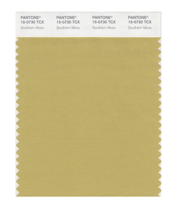 Southern Moss is a medium-toned color from the Pantone TCX collection, identified by the code 15-0730 TCX. This warm tone with its balanced character makes it an excellent choice for warm luxury, artisanal products, and natural branding.