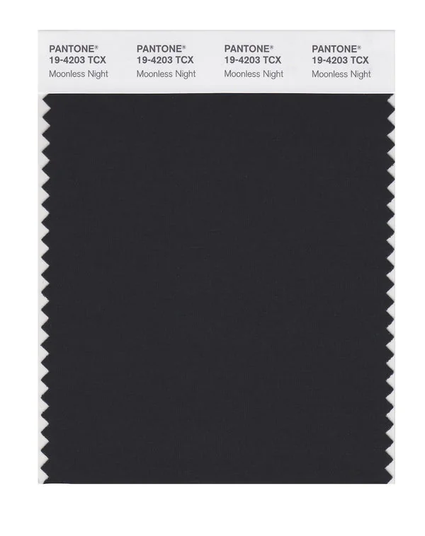 Moonless Night is a deep and rich black from the Pantone TCX collection, identified by the code 19-4203 TCX. This cool tone with its balanced character makes it an excellent choice for luxury branding, formal wear, and sophisticated design.