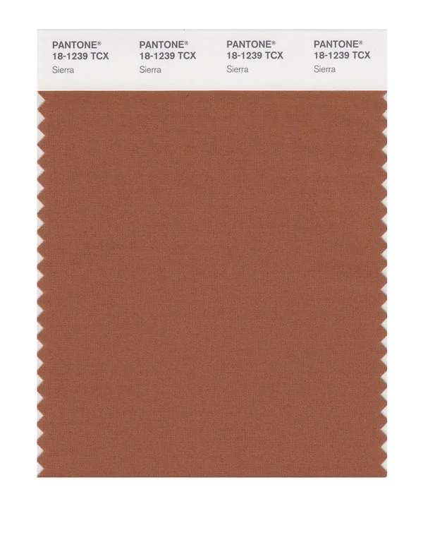 Sierra is a medium-toned orange from the Pantone TCX collection, identified by the code 18-1239 TCX. This warm tone with its balanced character makes it an excellent choice for energetic branding, autumn collections, and creative spaces.