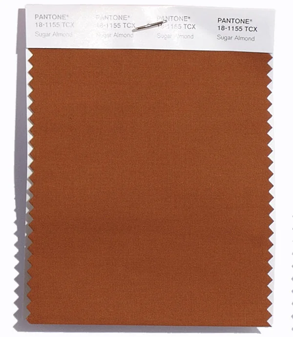 Sugar Almond is a medium-toned brown from the Pantone TCX collection, identified by the code 18-1155 TCX. This warm tone with its balanced character makes it an excellent choice for natural products, rustic design, and earthy branding.