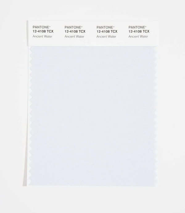 Ancient Water is a light and airy color from the Pantone TCX collection, identified by the code 12-4108 TCX. This cool tone with its soft and pastel character makes it an excellent choice for wellness products, gentle branding, and calming design.
