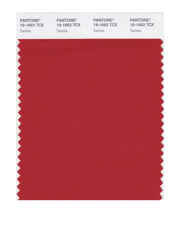 Samba is a medium-toned red from the Pantone TCX collection, identified by the code 19-1662 TCX. This warm tone with its balanced character makes it an excellent choice for bold branding, passionate designs, and statement pieces.