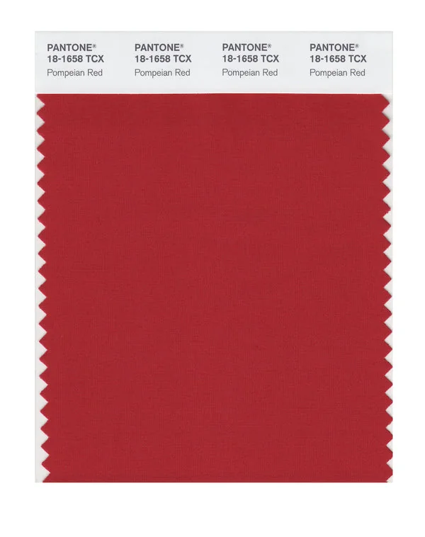 Pompeian Red is a medium-toned red from the Pantone TCX collection, identified by the code 18-1658 TCX. This warm tone with its balanced character makes it an excellent choice for bold branding, passionate designs, and statement pieces.